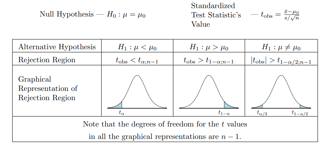 1.1 Summary for testing the mean when sampling from a normal distribution with unknown variance (one-sample \(t\)-test)