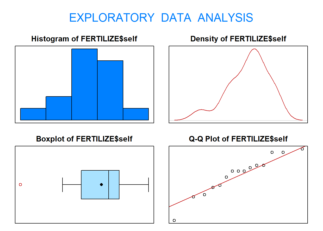 The results from applying the function EDA() to self fertilized plants suggest it is not unreasonable to assume that plant height for self fertilized plants follows a normal distribution. Now, proceed with the five-step procedure.