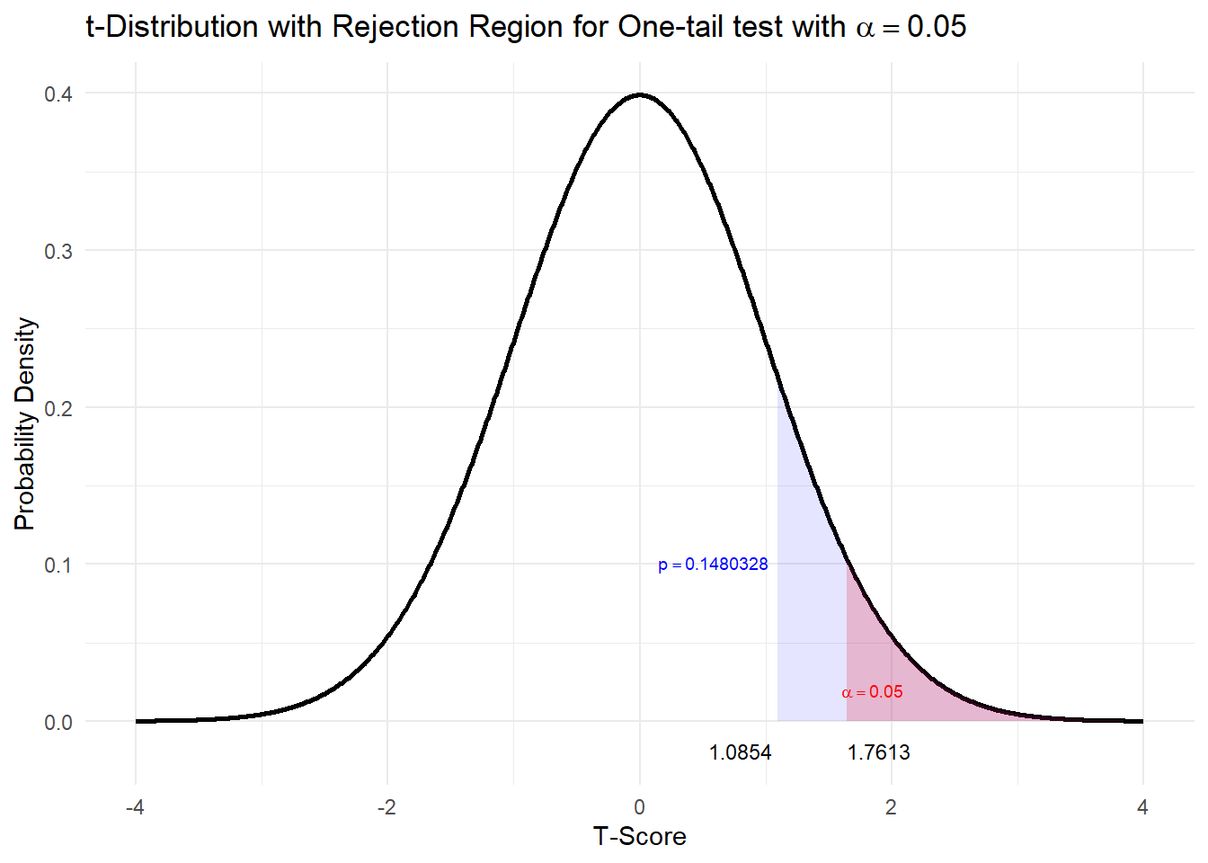 I. From the rejection region, we fail to reject \(H_0\) because the standardised test statistic is less than the critical value and hence outside the rejection region i.e \(t_{obs} = 1.0854 < 1.7613\).