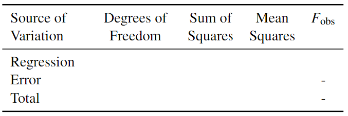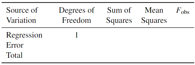 i.e. finding the degrees of freedom, the regression sum of squares, the error sum of squares,